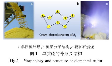硫,化学符号为S,原子序数16,属于氧族元素,电子排布Ne3s23p4。硫磺是硫元素的单质形式,室温下为淡黄色晶体(图1a),通过8个硫原子首尾相接组成冠状分子结构(图1b),质地较为柔软,具有特殊的刺激性气味。