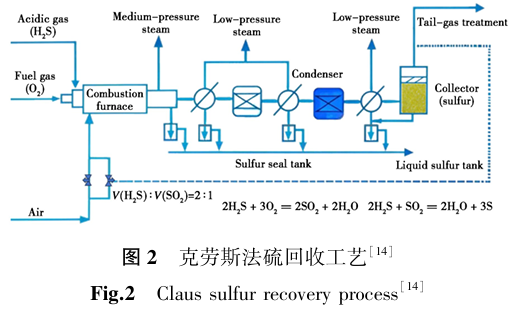 硫磺的来源及获取途径经历了从自然开采到工业化生产的演变过程。在自然界中,硫磺常以天然硫磺矿的形式存在。这些矿脉多分布于火山活动频繁的区域,在火山喷发过程中,地下深处的含硫物质被带到地表,经过一系列复杂的地质作用,逐渐形成硫磺矿。克劳斯法(Claus process)是目前石油和天然气工业中应用最广泛的硫回收方法。它是基于硫化氢(H2S)在高温下与氧气发生部分燃烧反应,生成二氧化硫(SO₂),然后二氧化硫与剩余的硫化氢在催化剂作用下发生反应,生成单质硫(图2)[14]。这种工业化生产方式不仅解决了能源生产中的环保问题,还极大地提高了硫磺的产量,满足了化学工业对硫磺的日益增长的需求。