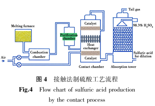 在化学化工领域,硫酸是最核心的化工产品之一,其产量常被视为国家工业发展水平的重要衡量标准,因此也被称为“工业之母”,而硫磺是制造硫酸的关键原料。通过接触法(图4)等工艺,硫磺经过沸腾焙烧,在高温下与氧气反应生成二氧化硫,经水洗净化后,在V2O5催化剂催化作用下,经过“两转两吸”工艺,二氧化硫最终转化为三氧化硫,生成的三氧化硫气体经过烟酸塔或98%硫酸酸吸收,最终生产出不同浓度的成品硫酸,尾气经过碱液或双氧水吸收后排空处理。