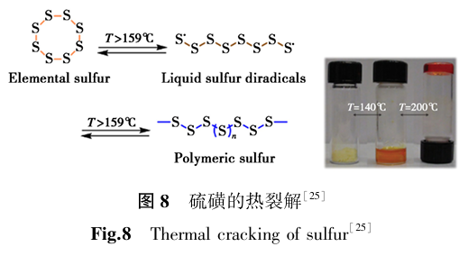 另一方面,硫磺在环状八元环结构中,S—S键的键能为36 kcal/mol,极易通过加热的方式均裂形成线型的多硫自由基,尤其是升高到159 ℃以上,熔融态的硫粘度显著提升,然而在降温后又重新可逆恢复到固态的冠状八边形结构(图8)。