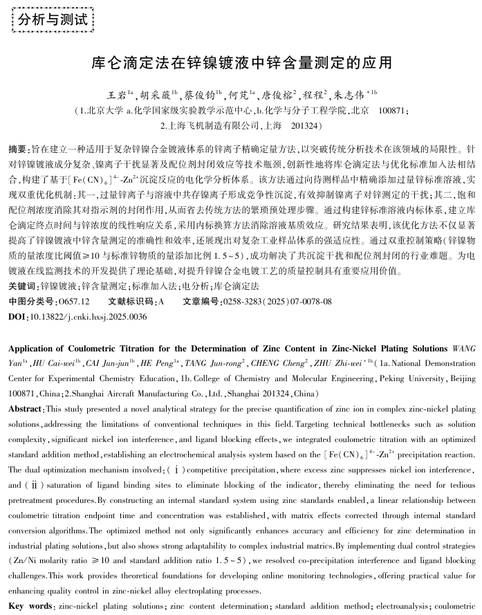 锌镍合金电镀因耐蚀性强,广泛应用于汽车、航空等领域,但镀液中锌测定长期受镍干扰与配位剂封闭效应限制。传统滴定法及库仑滴定法(基于[Fe(CN)6]4−-Zn2+沉淀反应)易受pH波动、镍共沉淀及配位剂干扰。本研究创新融合库仑滴定与标准加入法,通过过量锌标液实现双重调控:竞争抑制镍干扰、饱和配位剂消除滴定封闭,结合内标算法修正基质效应。该方法突破传统局限,解决了复杂镀液锌检测的行业难题,为在线监测技术开发奠定基础。