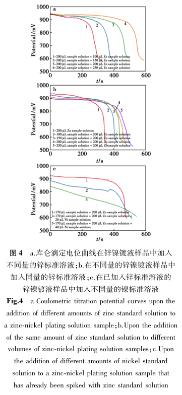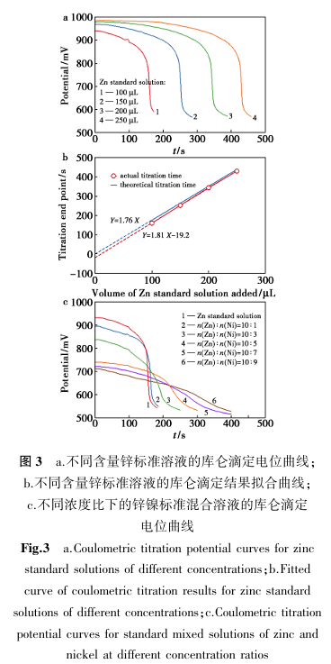 为了全面且深入地探究锌标准溶液以及溶液中镍含量对库仑滴定测定结果所产生的影响,我们设计了一系列实验,依次移取100、150、200和250 μL这4种不同体积的锌标准溶液(0.2735 mol/L),按实验方法进行库仑滴定,滴定曲线如图3a所示。