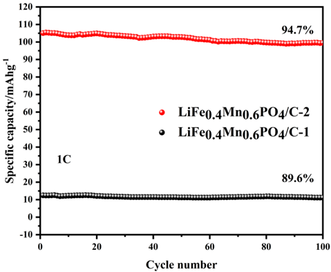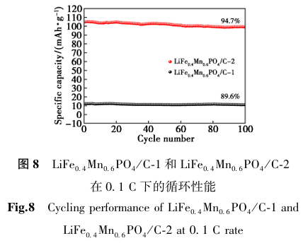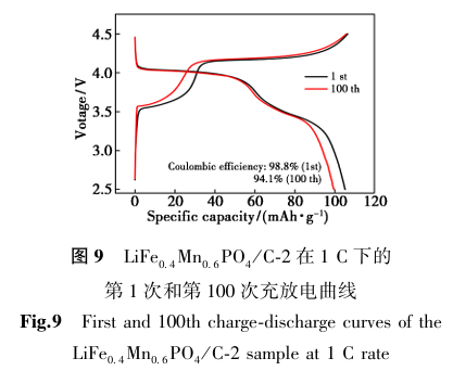 图8显示了LiFe0.4Mn0.6PO4/C-1和LiFe0.4Mn0.6PO4/C-2两种材料的充放电循环性能。在1 C循环100次后,LiFe0.4Mn0.6PO4/C-1和LiFe0.4Mn0.6PO4/C-2的容量保持率分别为89.6%和94.7%,LiFe0.4Mn0.6PO4/C-2循环稳定性明显高于LiFe0.4Mn0.6PO4/C-1。图9为LiFe0.4Mn0.6PO4/C-2在第1次和第100次充放电曲线,库伦效率分别达到98.8%和94.1%,说明该材料在充放电中具备良好的可逆性。