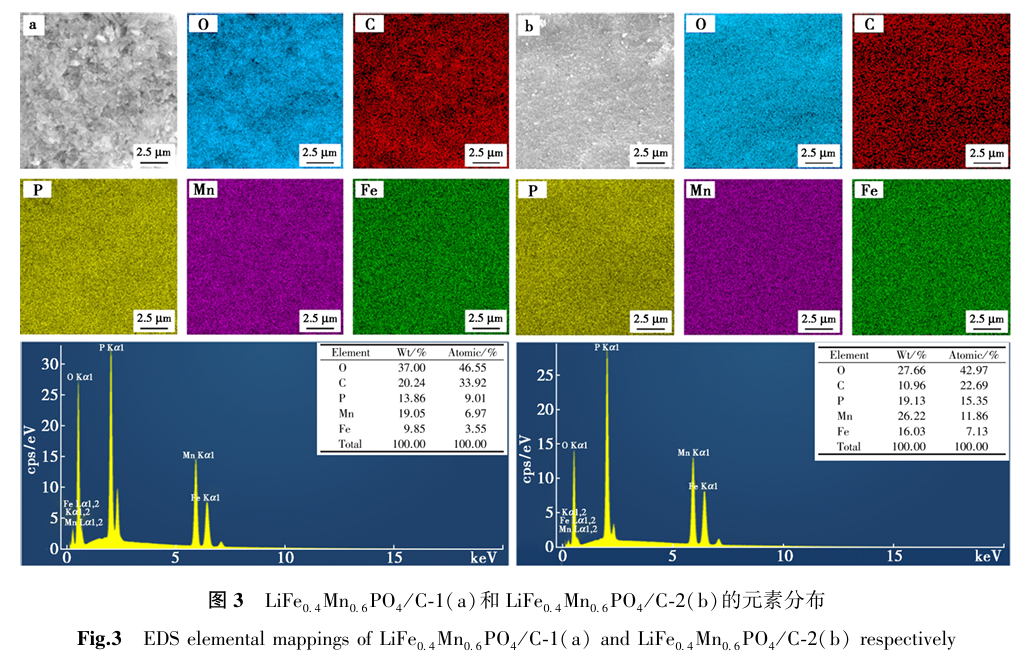 为进一步确定LiFe0.4Mn0.6PO4/C纳米材料的元素组成和分布,对制备的LiFe0.4Mn0.6PO4/C材料进行了EDS和元素Mappings分析,结果如图3所示。