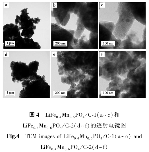 LiFe0.4Mn0.6PO4/C-1和LiFe0.4Mn0.6PO4/C-2两个样品透射电镜测试结果如图4所示。