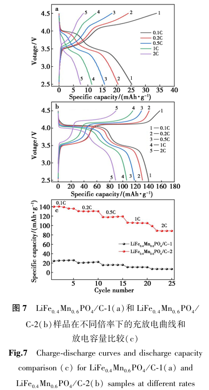 图7展示了LiFe0.4Mn0.6PO4/C-1和LiFe0.4Mn0.6PO4/C-2两个样品在0.1~2 C倍率(1 C=170 mAh/g)的充放电曲线和倍率性能。