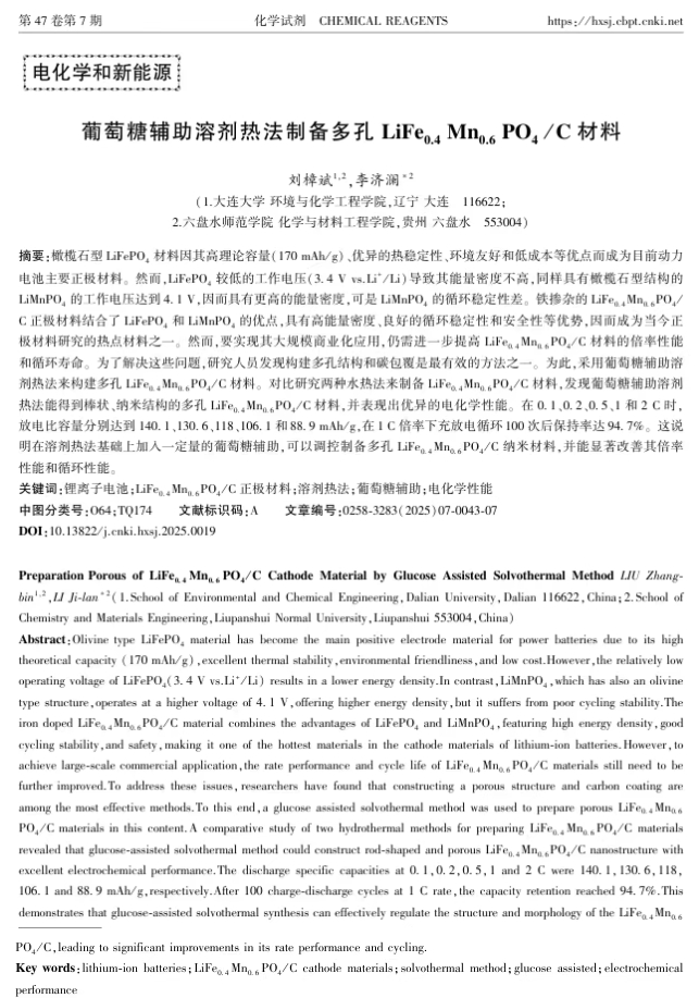 锂离子电池正极材料中的橄榄石型结构的磷酸盐材料因其优异的安全性和稳定性备受关注。LiFe₀.₄Mn₀.₆PO₄(简称LFMP)作为磷酸铁锂(LiFePO₄, LFP)和磷酸锰锂(LiMnPO₄, LMP)的固溶体材料,结合了二者的优势,成为当前研究热点。多孔材料因其独特的结构优势——高比表面积、可调控的孔道结构及丰富的活性位点,已成为突破传统正极材料容量与动力学限制的关键策略。基于以上考虑本文通过葡萄糖辅助溶剂热法来制备多孔LFMP材料。