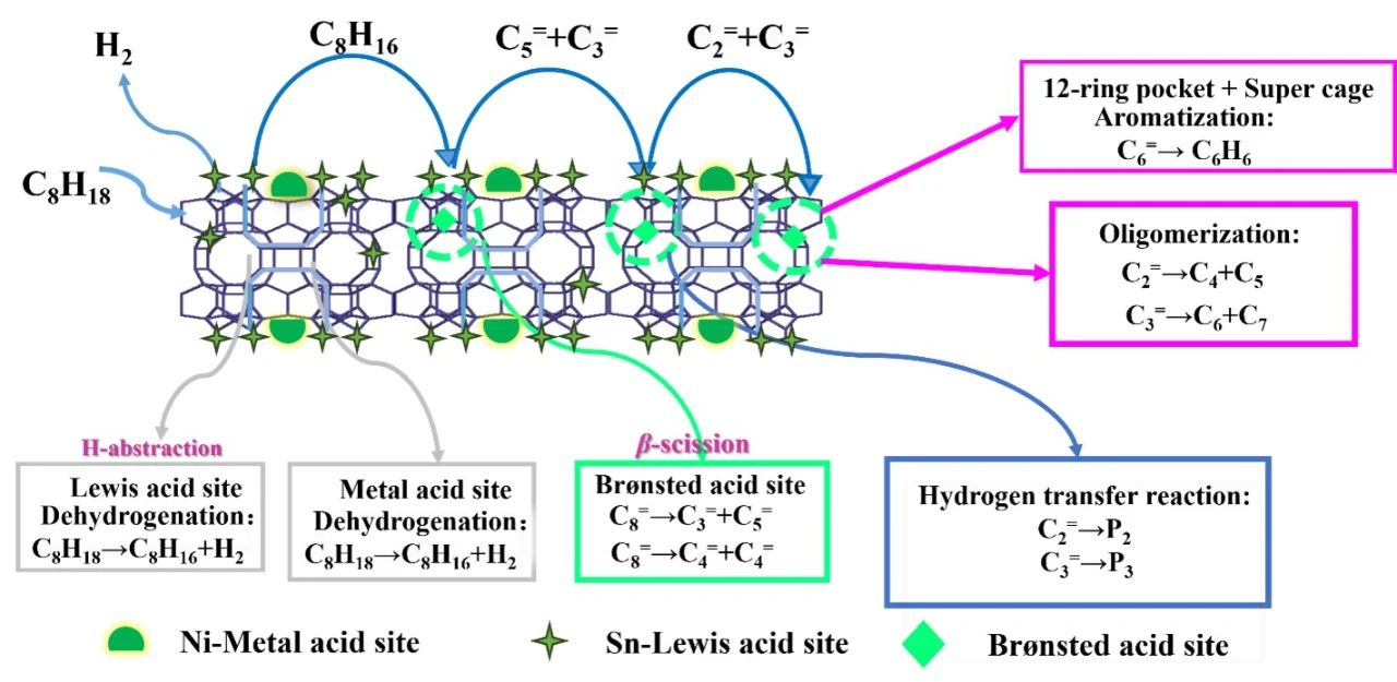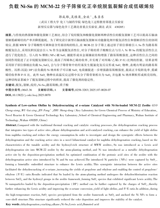 低碳烯烃,如乙烯、丙烯等是化学工业中重要的基础材料。传统上,蒸汽裂解是低碳烯烃的主要来源;然而这种方法有较高的能源消耗和二氧化碳排放等弊端。脱氢裂解采用脱氢和裂解相结合降低烷烃活化裂解的活化能,是采用石脑油生产低碳烯烃的一种新的工艺。MWW分子筛具有丰富的表面羟基和可调节的酸性位点,在MWW分子筛中引入Sn和Ni同作为路易斯酸脱氢活性位并与分子筛质子酸的裂解活性位产生协同作用,提高原料转化率和低碳烯烃收率。