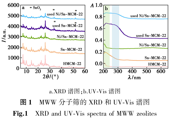 通过XRD对合成的MWW样品进行了表征,以研究负载金属Ni和Sn对MWW分子筛的影响。从图1a中可以看出,所有负载金属的样品都在7.1°、7.9°、10°、23.7°和26.1°处显示MWW的特征峰,样品的整体衍射峰强度较低,但MWW结构的特征峰强度较高,金属的负载并没有改变分子筛的结构。