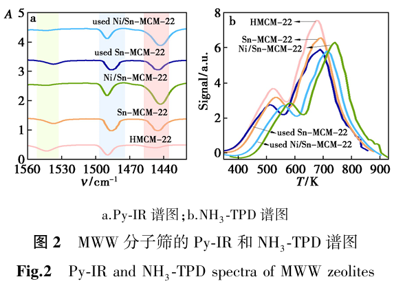 为进一步了解Ni和Sn负载对分子筛酸性的影响,对其进行Py-IR测试谱图如图2a所示。