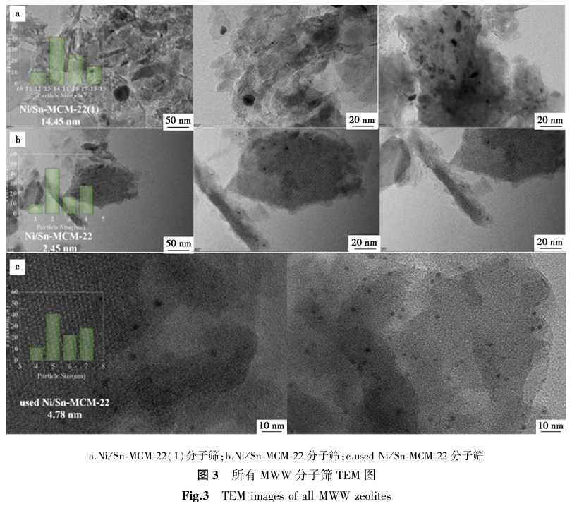 图3显示了所有MWW分子筛的TEM表征。图3a中Ni/Sn-MCM-22(1)中的Ni颗粒较大,且分布不均匀,说明在制备Ni/Sn-MCM-22(1)催化剂的过程中,Ni颗粒的聚集现象较为严重,大大影响了Ni 纳米颗粒的有效利用,同时也可能导致催化剂寿命低等问题。