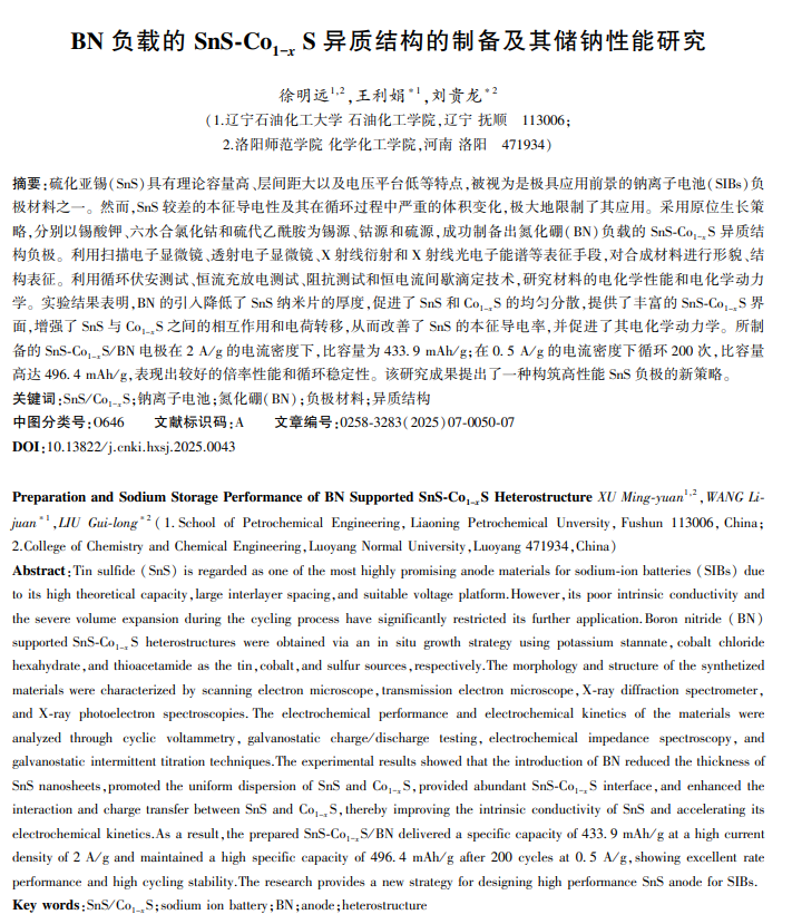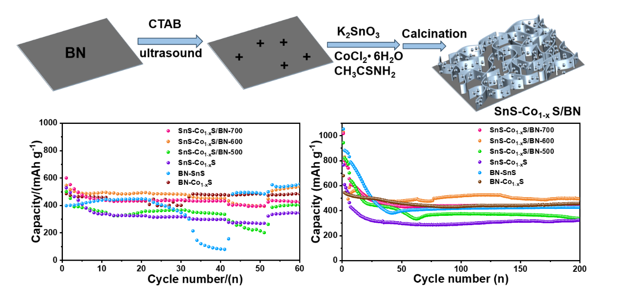 硫化亚锡具有理论比容量高、层间距大和电压平台低等优点,是一种极具有发展前景的钠离子电池负极材料。然而,较低的导电率和循环过程中巨大的体积变化,导致其容量衰减快。异质结不仅可在分子层面上调控电子结构,改善材料的导电率,加速电化学动力学;还可利用异质结构二次组装的结构稳定性改善复合材料的电化学稳定性。氮化硼(BN)具有高稳定性和高机械强度等性质,构建SnS-Co1-xS/BN异质结构不仅可以缓解电极材料在循环过程中的巨大体积膨胀,还可以增加材料的机械性能,从而改善SnS负极的电化学性能。