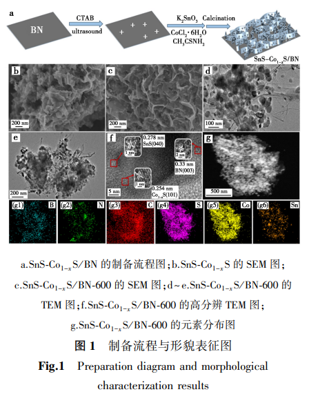 SnS-Co1-xS/BN的制备工艺如图1a所示。首先,将CTAB加入到商业BN中超声处理,使BN表面带正电荷。随后,K2SnO3中的SnO32-被静电吸附在BN上,CoCl2•6H2O中的Co2+被静电吸附在SnO32-上,化学吸附的SnO32-和Co2+在随后的水热过程中与硫代乙酰胺反应生成SnS和Co1-xS。