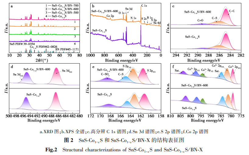 图2a中的X射线衍射(XRD)显示了对应于SnS和Co1-xS的特征峰;SnS-Co1-xS/BN-600中位于26.7 °的微弱的衍射峰,归属于BN,说明SnS-Co1-xS/BN复合物的成功制备。