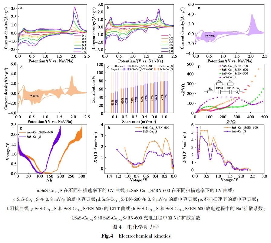 如图4a、4b所示,在扫速为0.1~1 mV/s时,SnS-Co1-xS/BN-600的CV曲线表现出良好的氧化还原特征峰,且峰移最小,表明SnS-Co1-xS/BN-600的极化程度低,电化学动力学较快[22,30-32]。