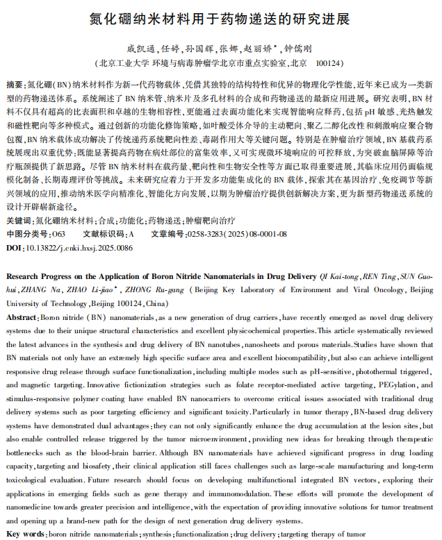 氮化硼(BN)纳米材料作为新一代药物载体,凭借其独特的结构特性和优异的物理化学性能,近年来已成为一类新型的药物递送体系。系统阐述了BN纳米管、纳米片及多孔材料的合成和药物递送的最新应用进展。研究表明,BN材料不仅具有超高的比表面积和卓越的生物相容性,更能通过表面功能化来实现智能响应释药,包括pH敏感、光热触发和磁性靶向等多种模式。通过创新的功能化修饰策略,如叶酸受体介导的主动靶向、聚乙二醇化改性和刺激响应聚合物包覆,BN纳米载体成功解决了传统递药系统靶向性差、毒副作用大等关键问题。