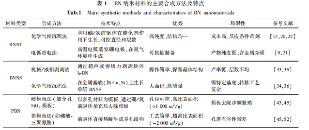 BN是一种人工合成的晶体化合物,其结构特征与石墨相似,其中硼和氮原子以交替排列的方式取代了碳原子的位置。BN能够在多种晶格结构中与碳形成同构体,其形态包括零维笼状结构、一维纳米管、二维纳米片以及三维类金刚石晶体结构。在BN的合成领域,研究人员已开发出多种制备方法,其中包括高温加压法、化学剥离法、冷冻干燥法、化学气相沉积法、硼墨法、微流化法以及液相剥离法等[11]。这些方法为BN的多样化应用提供了坚实的材料基础。以下总结概括了BN纳米管(BNNT)、BN纳米片(BNNS)和多孔BN(PBN)的主要合成方法,如表1所示。
