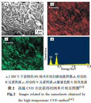 Wang等[39]在氨气环境下,通过对硼酸铵氢氧化物水合物前体进行高温退火,实现了无基底和无催化剂的BNNS制备。此外,无基底条件下,通过尿素和硼酸的直接化学反应也可制备BNNS[40]。高温CVD方法可以通过以B2O3、N2和三聚氰胺为原料,合成大量具有独特尺寸分布的h-BN纳米片[41],如图2所示。该合成路线具有无模板、低温简便和高产率等优点。“化学吹制”路线法也被用于高效制备BNNS,其特点是横向面积大且产量高[42]。