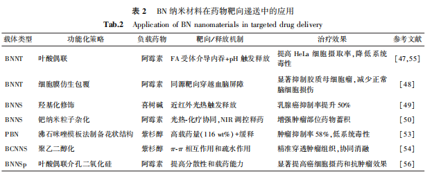 纳米生物技术的革新推动了抗癌药物递送系统的快速发展,其中多种纳米载体被广泛应用,包括纳米片、纳米球、纳米管、纳米载体、微针、纳米胶囊、基于树枝状聚合物的脂质纳米颗粒以及胶束等。在众多生物医学应用的纳米系统中,碳基材料和BN基材料因其独特的物理化学性质,在过去几年中已成为药物递送领域的研究热点。本节将系统综述BNNT、BNNS以及PBN纳米材料在药物递送中的应用进展,如表2所示。