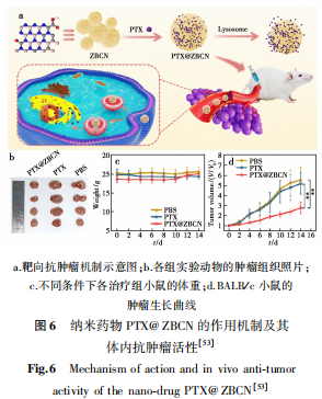 PBN在结构上与活性炭相似,呈现乱层至无定形特征,由交替排列的硼和氮原子组成的六元环构成。其独特的物理化学性质,包括优异的热稳定性、丰富的表面化学特性以及高SSA,使其成为癌症治疗中极具潜力的药物递送载体。Weng等[52]通过碳原子在石墨碳氮化物中的热取代反应直接合成了高水溶性的PBN,通过各种显微和光谱技术对所得PBN的结构和化学成分进行分析,证实了所得产物具有高羟基化度;并通过细胞实验,证实了这种高水溶性的PBN具有良好的生物相容性和抗癌药物装载、释放和递送的性能。Wang等[53]以沸石咪唑骨架结构(ZIF-L)为模板,成功制备了具有花状结构的PBN碳(ZBCN)纳米材料(图6),该材料表面丰富的羟基使其在水溶液中表现出优异的分散性和稳定性,独特的花状结构赋予材料高达340 m²/g的SSA和1.03 cm³/g的孔隙体积,丰富的介孔结构使其对紫杉醇(PTX)的负载能力达到116 wt%。体内抗肿瘤实验结果表明,ZBCN肿瘤抑制率达到58%,而且表现出低系统毒性和高生物安全性。