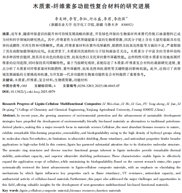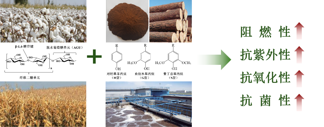 2. 重点揭示了木质素芳香结构与活性官能团对纤维素基材料阻燃、抗紫外及抗氧化性能的协同增强机制,为多功能材料设计提供了理论依据,涵盖了近5年突破性研究;