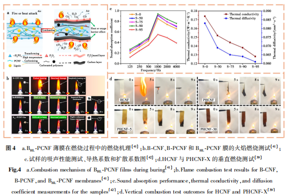 木质素因其独特的芳香族结构(富含-PhOH、甲氧基及共轭芳环)展现出优异的阻燃性能,成为纤维素基材料的理想阻燃添加剂[12]。基于此,Zhang等[41]以木质素和纤维素为原料,采用溶剂流延工艺成功制备了木质素-纤维素复合薄膜(B-PCNFs),该材料不仅具备良好的力学性能,其阻燃性能也得到显著提升(图4a、4b)。除了传统的薄膜材料外,研究人员还在探索其他形式的复合材料。Wang等[42]采用纤维素作为绿色粘合剂,开发了一种基于离子液体溶解-去离子水再生的简易工艺,实现了纤维素与木质素在微纳尺的自组装。所得气凝胶表现出优异的力学性能、高效吸声特性和出色的隔热性能(图4c)。该研究为木质素的高值化利用开辟了新途径。Ye等[39]采用三元低共熔溶剂(TDES)预处理技术,通过加入木质素(Lignin-SP)使纳米复合薄膜的极限氧指数突破52.5%,显著提升了复合材料的阻燃性能,符合难燃材料标准(图4d)。同时,该材料还兼具优异的力学性能(152.3 MPa)和紫外屏蔽性能(>98.9%)。这些研究不仅证实了木质素在提升纤维素基材料阻燃性能方面的关键作用,更为开发新型可持续功能材料提供了重要的技术参考。