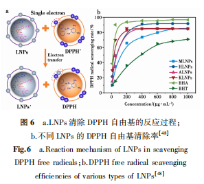 木质素分子中含有大量芳香环结构和丰富的极性基团(如-PhOH和甲氧基等),这些官能团可以与DPPH的单电子配对,从而有效延缓或阻止自由基等氧化物诱导的氧化过程[32]。Li等[48]的研究揭示了木质素纳米颗粒(LNPs)清除DPPH自由基的机理(图6):LNPs通过电子转移机制,将电子传递给DPPH·,同时DPPH·获得一个电子形成DPPH。在应用研究方面,Riaz等[20] 将椰枣树叶提取的木质素与羧甲基纤维素(CMC)复合,不仅提高了薄膜的力学性能,还显著增强了其抗氧化能力。Zhu等[49]将3种预处理木质素掺入羧甲基纤维素膜中,研究表明所制备的薄膜具有优异的紫外线(UV)屏蔽能力、水蒸气阻隔性能、疏水性、热稳定性、抗菌性和抗氧化性。其中,对紫外线的屏蔽率为100%,对DPPH自由基和ABTS自由基的清除率分别为99.5%和54.2%。此外,An等[50] 基于Diels-Alder反应开发的新型可再生共聚物,既保持了纤维素纳米晶(CNCs)的机械强度,又保留了木质素的天然抗氧化活性。这些研究不仅阐明了木质素活性基团与材料性能的关系,更为开发高性能生物基包装材料提供了新的技术路径。