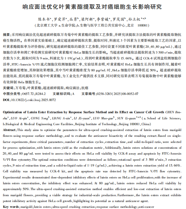 叶黄素酯作为视觉健康的重要成分已被广泛应用,天然叶黄素酯主要来源于万寿菊,其花瓣中酯化叶黄素含量可达干重的20%以上。本文优化了一种新的提取叶黄素酯技术—超速破碎提取,最优提取工艺:提取转速为3500 r/min,提取次数为3次,提取时间为9 min,料液比为1:19(g/mL),得到叶黄素酯提取率为15.66 %。同时探究了叶黄素酯对Hela细胞生长影响,当叶黄素酯浓度为80 μg/mL时, HeLa细胞存活率降低近50%。为叶黄素酯的提取工艺和生理活性提供了技术支持和数据参考。