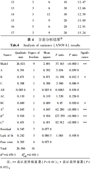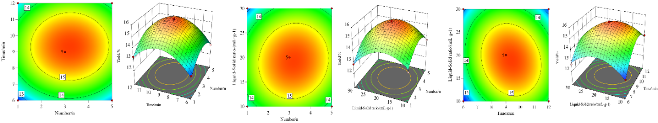 按照上述设计的响应面实验进行结果检测,把不同的提取次数(A)、提取时间(B)、液料比(C)的实验的收率(Y)列在表3中。应用Design-Expert 13.0软件对设计的3因素3水平的实验结果进行多项式拟合计算,响应面优化的分析结果和方差分析列在表4中。