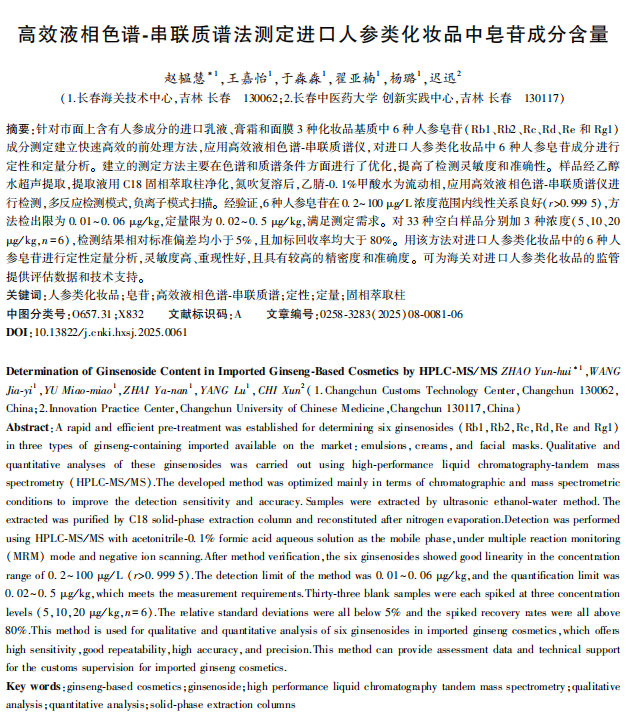 以人参为主要功效成分的护肤品有上百个品牌,且以韩国、日本为主这些产品中添加的主要提取物均来源于人参提取物和皂苷类成分,但是,这些动辄数千元的进口人参类化妆品中是否含有人参皂苷,其含量如何并未得到相应的检测和监管,让商家钻了空子,大肆宣传其功效。因此,对于进口人参类化妆品中皂苷成分的检测具有重要的现实意义。本研究能够为海关监管提供技术指导和决策支持,进而保障我国消费者的健康和安全。