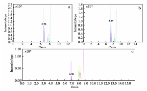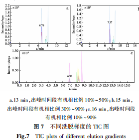 通过优化流动相梯度洗脱、进样量、流速等条件得到最佳的色谱条件,尝试不同时间不同浓度梯度洗脱,发现时间长且高浓度梯度洗脱时,6种人参皂苷成分响应及分离程度较好,优化色谱条件后,不仅提高了方法的灵敏度,而且较完全分离了具有相同分子量的异构体Rb2和Rc以及其他物质,实现对人参皂苷成分的高效分离和准确检测。图7是不同洗脱条件下的TIC图。