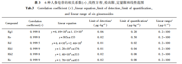 准确移取6种人参皂苷的混合标准中间液,用V(0.1%甲酸水):V(乙腈)=9:1配制成0.2 ~100 µg/L的混合标准工作液,在给定的仪器条件下进行液相色谱-串联质谱测定,并绘制标准曲线[22-26]。结果如表3所示,6种人参皂苷呈现出良好的线性关系,相关系数r在0.999以上。根据最低添加浓度的信噪比数据,分别确定人参皂苷的检出限(LOD)与定量限(LOQ)。