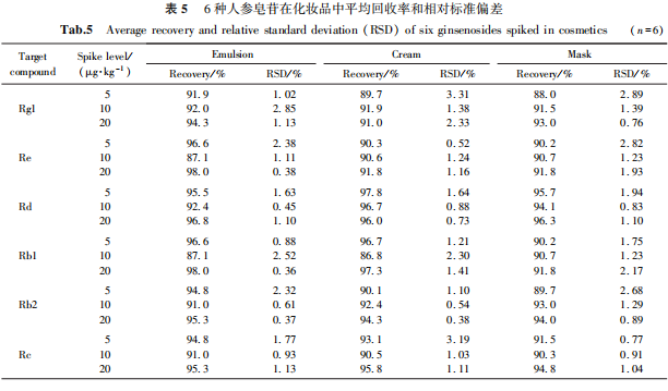 用3种空白基质(乳液,膏霜、面膜)配置成混合标准工作液,浓度水平分别为5、10、20 μg/kg,每个浓度水平重复测量6次,计算其准确度和精密度。乳液的平均回收率为87.1%~98.0%,相对标准偏差(RSD)为0.36%~2.85%,膏霜的平均回收率为 86.8%~97.8%,RSD为0.38%~3.31% ,面膜的平均回收率为88.0%~96.3%,RSD为0.76%~2.89%,从结果可以看出,3种化妆品类的RSD均小于5%,且平均加标回收率均大于80%,用该方法对进口人参类化妆品中的6种人参皂苷进行定性定量分析,灵敏度高、重现性好,且具有较高的精密度和准确度,能够满足检测要求。相关结果见表5。