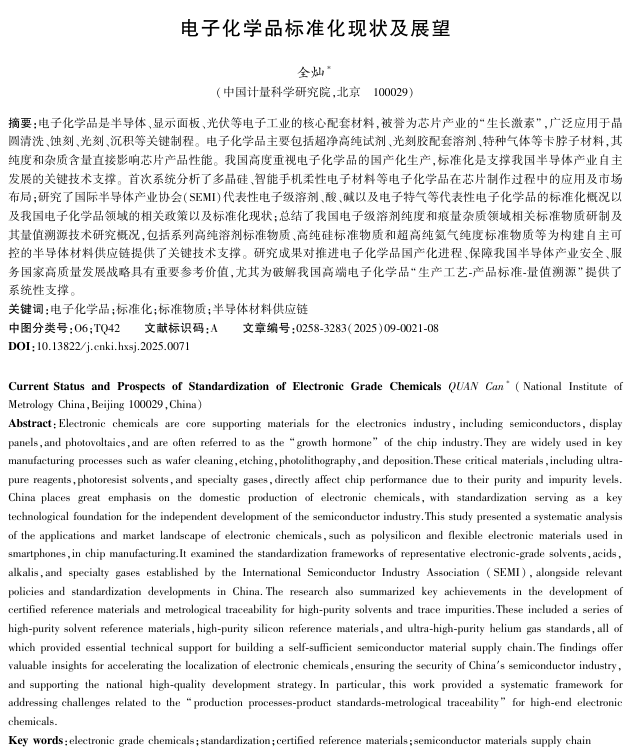 电子化学品是半导体、显示面板、光伏等电子工业的核心配套材料,被誉为芯片产业的“生长激素”,广泛应用于晶圆清洗、蚀刻、光刻、沉积等关键制程。电子化学品的纯度和杂质含量直接影响芯片产品性能。目前电子化学品国际标准主要由国际半导体产业协会(SEMI)主导,我国高度重视电子化学品的国产化和标准化,通过自主创新逐步打破国外垄断。未来,随着AI、新能源汽车等需求激增,电子级化学品行业需加速技术升级、国际标准对接、绿色化转型和结果的计量溯源性,以增强全球竞争力。