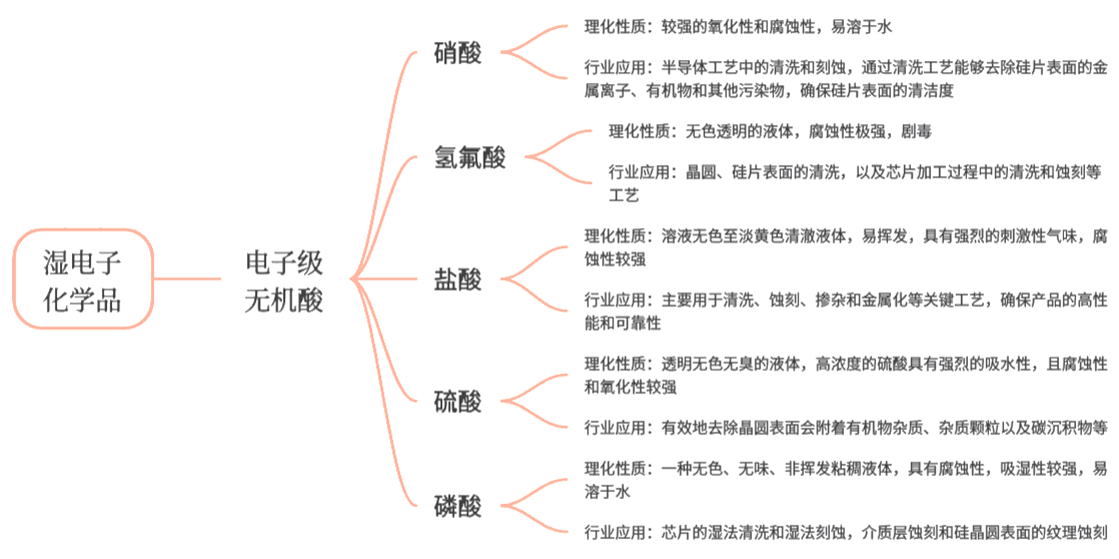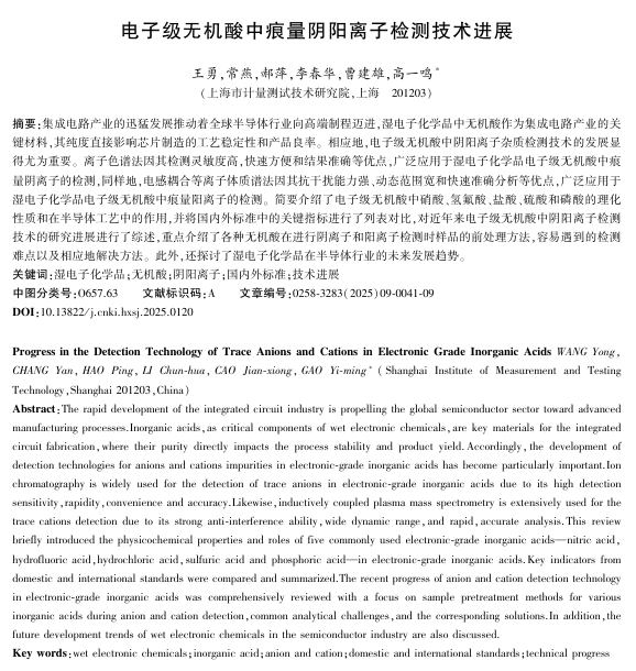 湿电子化学品中无机酸作为集成电路产业的关键材料,其纯度直接影响芯片制造的工艺稳定性和产品良率。无机酸主要包括电子级硝酸、氢氟酸和盐酸等,在晶圆清洗、光刻胶去除、金属蚀刻等关键工艺中发挥重要作用,能够有效去除表面污染物、优化材料特性,并提升器件良率。相应地,电子级无机酸中阴阳离子杂质检测技术的发展显得尤为重要,目前主流方式是使用离子色谱法和电感耦合等离子体质谱法进行分析检测。随着工艺制程的延伸,半导体行业对电子级无机酸的要求也越来越高,在面对挑战的同时也迎来了前所未有的发展机遇。