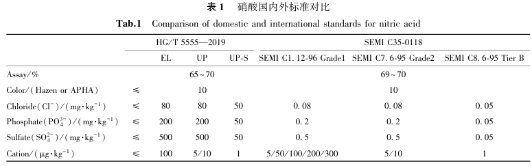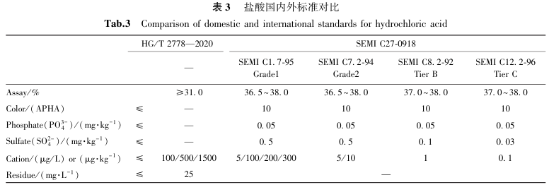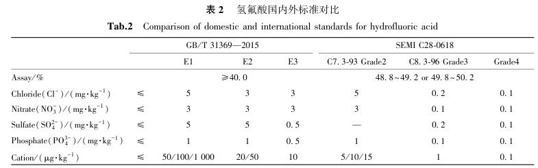 表3将上述两个标准进行了部分对比,可以看出化工行业标准对于磷酸盐及硫酸盐并未作相应的规定,而SEMI标准对于磷酸盐的限度均在0.05 mg/kg,对于硫酸盐的限度随着规格的不同各有差异。在阳离子的技术规格方面,SEMI C12.2-96 Tier C的技术规格较高,均不得大于0.1 μg/kg。