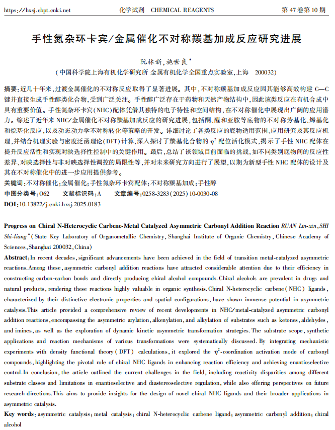 5. 阮林新,施世良*.手性氮杂环卡宾/金属催化不对称羰基加成反应研究进展[J].化学试剂,2025,47(10):68-74.
