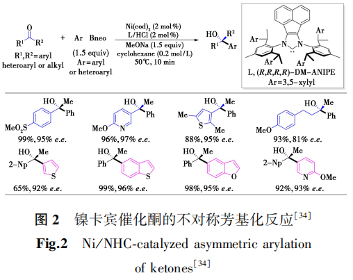 2021年,本课题组报道了镍/NHC催化芳基硼酸酯对酮的不对称加成反应(图2)[34]。在镍/NHC的催化下,芳基硼酸酯可以快速(<10 min)和酮羰基发生加成反应,经由后处理水解后得到手性叔醇产物。该方法具有温和的反应条件、广泛的底物适用性、优异的官能团兼容性以及优秀的对映选择性(高达99%收率和97%e.e.)。酮底物涵盖芳基-烷基酮、烷基-烷基酮、环酮及含杂环酮等;硼酸酯部分也可适用于多种芳基及杂芳基底物。该反应还可以应用于多种药物分子的后期修饰和改造。