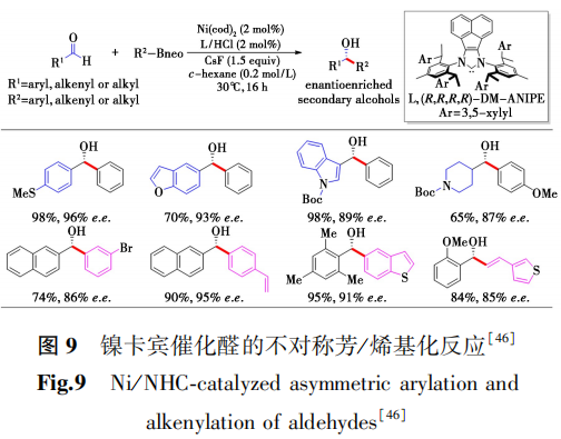 2001年,Fürstner等[44]首次报道了铑催化的非手性NHC配体参与的芳基硼酸对醛的加成反应。2005年,Bolm等[45]报道了该反应的手性版本,使用大位阻的单齿手性NHC配体,手性仲醇产物最高仅有38%的e.e.。基于镍卡宾催化剂和羰基的η2配位活化模式,本课题组2021年报道了氮杂环卡宾镍催化醛的不对称芳基化和烯基化反应(图9)[46]。该反应条件温和,具有普适的底物范围和优秀的官能团兼容性,并且能够实现优秀的化学选择性和对映选择性控制。