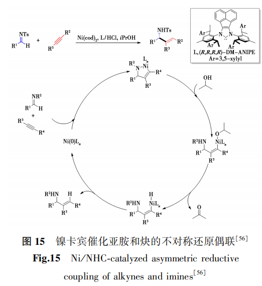 手性胺广泛存在于药物和生物活性分子结构之中,同时也是十分重要的小分子砌块,手性胺的高效不对称合成是有机化学的重要研究领域。亚胺的不对称加成是合成手性胺最为直接的策略之一,近年来受到化学家们的广泛研究。2009年,Shi等[55]利用其发展的带有2个NHC的双齿手性氮杂环卡宾配体与钯结合,实现了亚胺与芳基硼酸的不对称加成反应,手性二级胺产物最高可达90%e.e.。2019年,Ye等[56]报道了醛亚胺和炔烃的不对称还原偶联反应(图15),使用大位阻的手性氮杂环卡宾作配体,异丙醇作还原剂,以良好至优秀的对映选择性(51%~91% e.e.)合成手性烯丙基胺。氘代标记实验结果表明产物中的氢完全来自于异丙醇。在此实验基础上,作者提出了可能的反应机理:镍卡宾催化亚胺和炔烃发生氧化环合生成五元环镍中间体,在异丙醇作用下质子解开环,最后发生β-氢消除和还原消除得到产物并且再生催化剂。