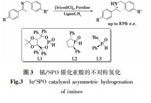 2003年,Jiang等[19]探索了type I型二级膦氧配体L1、L2和type II型二级膦氧配体L3在铱催化苄胺与苯乙酮缩合生成亚胺的不对称氢化中的应用。他们发现:当金属与配体物质的量比为n(Ir):n (SPO)= 2:1时,配体L1~L3均表现出较好的催化活性,其中L3给出最高69% e.e.。受Crabtree催化剂[Ir(PCy3)(Py)(COD)]PF6在烯烃氢化中具有高活性的启发[20],进一步向催化体系中加入与二级膦氧配体等量的吡啶,发现催化活性有明显提高,反应时间由51 h缩短至24 h,且对映选择性提高到78%。降低二级膦氧配体的用量n(Ir):n (L3) :n (Py)= 1:1:2,氢化反映效果依然可以保持(图3)。作者推测吡啶可能作为共配体改善了催化剂的活性和对映选择性。这一结果为后续混合配体体系的研究奠定了基础。