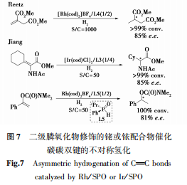 Reetz等[21]将配体L4应用于铑催化的衣康酸二甲酯的不对称氢化中,在千分之一的催化剂用量下底物可以完全转化,取得85%e.e.。Jiang等[25]发现type II型二级膦氧配体L3和L5在铑和铱催化的多类官能团化烯烃包括α-和β-脱氢氨基酸酯、烯酰胺、烯醇碳酰胺以及衣康酸二甲酯等的氢化中能获得中等到良好的对映选择性(最高为85%e.e.,图7)。