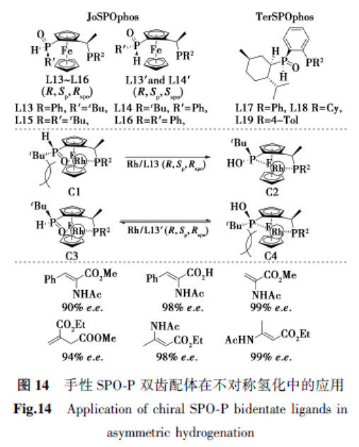 2010年,Solvias公司的Landert 等[33]将二级膦氧单元与三价膦基团结合起来,设计合成了基于二茂铁骨架的JoSPOphos L13~L16和苯基骨架的TerSPOphos L17~L19。其中,磷原子绝对构型相反的配体L13和L13’在与金属铑配位时表现出明显的区别。L13与铑形成以两个磷原子配位的C2,而L13’则同时产生P,P配合的C4和P,O配合物C3。作者推测这是由于SPO基团的叔丁基与二茂铁骨架之间的空间位阻导致的。对于α-和β-脱氢氨基酸(酯)、及衣康酸二甲酯的不对称氢化,基于这两类杂合双齿配体的铑配合物表现出卓越的催化性能(TON可达1 000,TOF可达20000 h-1)。这两类杂合双齿配体在铑催化的多种α-和β-脱氢氨基酸(酯)以及衣康酸二甲酯的不对称氢化表现出优异的催化活性(TON可达1000,TOF可达20000 h-1)。在1%的催化剂用量和常压氢气下,通过选用合适结构的配体,各类底物的氢化产物都能达到98%~99% e.e.。特别是使用配体L14时,6种氢化产物的e.e.值都在90%以上(图14)。