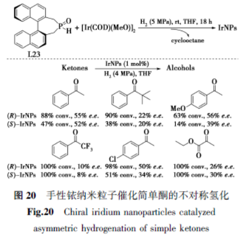 2016年,Cano等[39]通过氢气还原[Ir(OMe)(COD)]2和SPO(L23),合成了手性铱纳米粒子IrNPs。作者通过圆二色光谱证实了由R和S对映体稳定化的纳米粒子展现出清晰的镜像信号,表明手性可以传递到纳米粒子上。利用该纳米粒子能够促进简单酮类化合物的不对称氢化,取得一定的对映选择性(最高56%e.e.,图20)。这是由SPO配体稳定的金属纳米粒子催化的不对称氢化反应的首次报道,也是首个非负载型手性IrNPs催化的不对称氢化反应的例子。一系列的机理研究和理论计算揭示了IrNPs表面的活性位点和反应机理,表明底物可能通过与手性配体的相互作用(如氢键)来实现对映选择性产物的形成,为手性纳米粒子催化剂的设计和开发提供了新的思路。