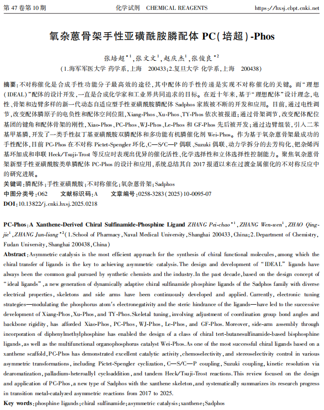 本篇综述聚焦于Sadphos家族中最成功的成员之一——PC-Phos。该配体首创性地将刚性氧杂蒽骨架与动态自适应的手性亚磺酰胺单元相结合,其独特的“手性柔性边臂”能够为不同反应精准构建“限域手性微环境”,从而实现了催化性能和选择性的巨大飞跃,为解决多个长期存在的合成难题提供了原创性解决方案,也有助于推动手性医药、农药及材料等领域的发展。