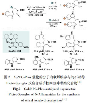 金催化的官能团化的联烯分子内环化反应作为一种最强大和最直接的合成工具用来原子经济性的构筑环状分子骨架。尽管金(I)催化的分子间的联烯胺的环加成反应取得了很大的进展,分子内高选择性的不对称环化依然是一个挑战性的课题。2017年,本课题组首次开发了一种不对称Au(I)/PC-Phos催化的分子内联烯胺Pictet-Spengler环化反应,模块化合成了一系列手性四氢咔啉,并将其应用于天然产物(R)-Deplancheine、Desbromoarborescidine A和Desbromoarborescidine C等核心中间体的合成(图2)[11]。该策略解决以下挑战:抑制分子间联烯胺的二聚化且促进分子内环化;控制吲哚在C2位而非C3位反应以及联烯胺在α-位而非γ-位反应。根据产物结构和配体构型,提出了可能的不对称诱导模型:底物磺酰基O与催化剂氮氢形成氢键,配体的4-甲氧基苯基作为手性柔性边臂,屏蔽了联烯的Si面,吲哚从Re面进攻形成高对映选择性产物。