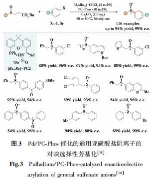 手性亚砜在天然产物、药物化学(如埃索美拉唑、莫达非尼)及不对称合成中应用广泛,是重要的手性助剂、配体和有机催化剂。传统合成方法存在局限性:亲核取代法依赖高活性锂或镁基亲核试剂,官能团耐受性差;金属催化不对称氧化法面临强氧化剂限制官能团兼容性及过度氧化为砜的问题。因此,开发高效、通用的手性亚砜不对称合成方法极具价值。此前研究存在对映选择性低、底物范围有限等问题,缺乏能同时适用于烷基和芳基亚磺酸根阴离子的通用催化体系。2018年,本课题组报道了Pd/PC-Phos催化对映选择性芳基化合成手性二芳基亚砜;同时解决了烷基次磺酸阴离子芳基化手性转化较低的难题(图3)[18]。Pd/PC-Phos 催化对映选择性芳基化合成手性亚砜,也是目前最好的催化体系。该方法能够进一步应用于Sulindac的手性合成。单晶衍射表明,PC-Phos配体通过 O,P -原子与钯(II)中心形成罕见的十一元环结构,这也是Sadphos家族配体首次应用于钯催化的反应。