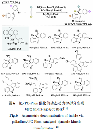 手性螺环戊烷吲哚啉衍生物是一类具有广泛生物活性的重要骨架,在药物化学和天然产物合成中具有重要价值。动态动力学拆分(DKR)是构建富对映体分子的高效策略,可将外消旋体完全转化为目标手性产物。然而,通过吲哚的去芳构化反应实现轴手性到中心手性的立体收敛转化仍面临挑战。2020年,本课题组实现了Pd/PC-Phos催化的吲哚与炔烃的动态动力学拆分的不对称去芳构化反应(DKR/CADA),高效模块化构建了手性螺环化合物,具有操作简便、效率高、对映选择性优异、底物范围广和衍生化多样等特点(图6)[21]。该方法为含手性螺吲哚啉和螺吲哚骨架的生物碱及药物合成提供了新途径,通过控制实验和SAESI-MS对反应中间体的检测发现PC-Phos与Xantphos杂化配位的钯配合物,是促进该反应高对映选择性的活性中间体。