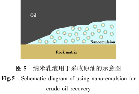 在油田开采方面,纳米乳液的使用已被证实可以极大地提高石油采收率(EOR)。纳米乳液中包载的纳米颗粒可以吸附在油-水界面,降低了油-水界面张力,使得原油更容易从岩石表面剥落,被驱逐液驱出(图5)。