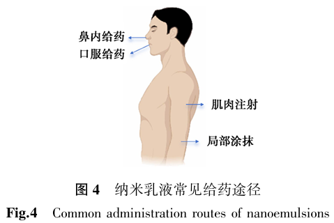 对于许多在水中溶解性差的脂溶性药物,以及易受光、热、氧气、pH等因素影响稳定性差的药物,药物的生物利用度受到了极大的限制。而纳米乳液同时含有油相与水相,完美解决了脂溶性药物的溶解问题(图3);同时,药物被包载于分散相中,可以有效保护药物的活性成分。目前,鼻腔给药、口服给药、注射给药、局部涂抹等各种给药途径均已有所应用(图4),尤其因纳米级尺寸易于透过皮肤角质层,纳米乳液局部制剂在当下深受青睐。